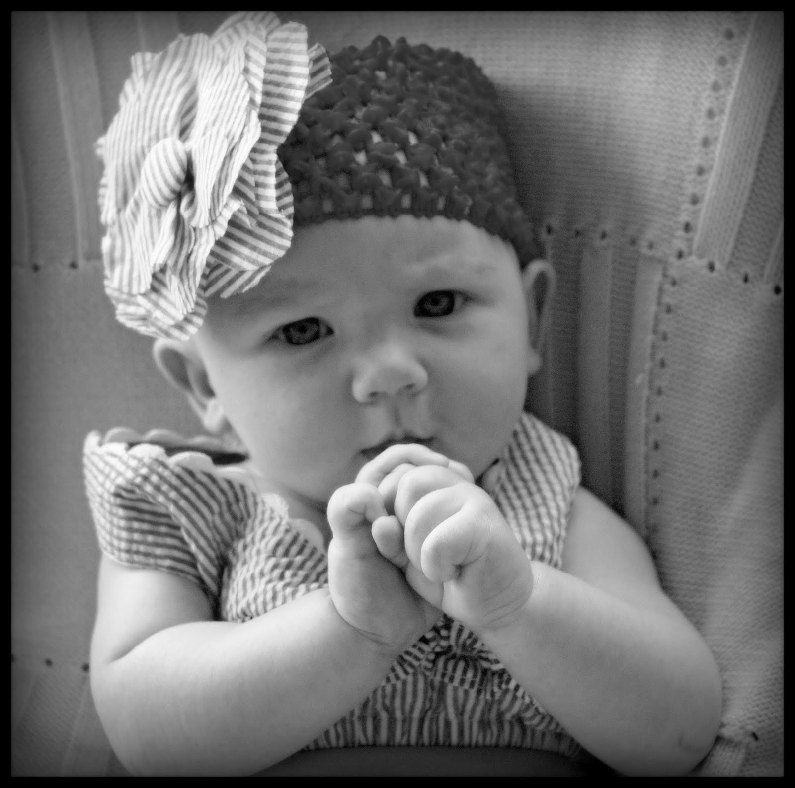 Yep, she's 3 months old - and already has quite the little personality! In the past month Lil has really became aware of her surroundings! She looks all around when we walk into a room with her and she just loves to "talk." I've wanted to her stay a newborn so long that I wasn't ready when all these milestones starting happening - rolling over for the first time (at 2 1/2 months old on the seat of the pontoon boat!), giggling, making "goo" and "gah" sounds, pushing up on her elbows, discovering her hands, reaching and holding on to toys. But one of her biggest accomplishments is sleeping through the night...what an angel baby! The past week Lil has been sleeping through the night on most nights - something her brother never did until after I weaned him at a year old! Because of wanting her to stay little, I seemed to forget how fast they go from one stage to the next. My mom had to remind me the other day that she could probably sit in her Bebe pod chair now and that I needed to put her on her play mat more often. So in the next month or so we'll probably be getting out the exersaucer and jumper as well! It all comes way too fast...do they have to grow up?